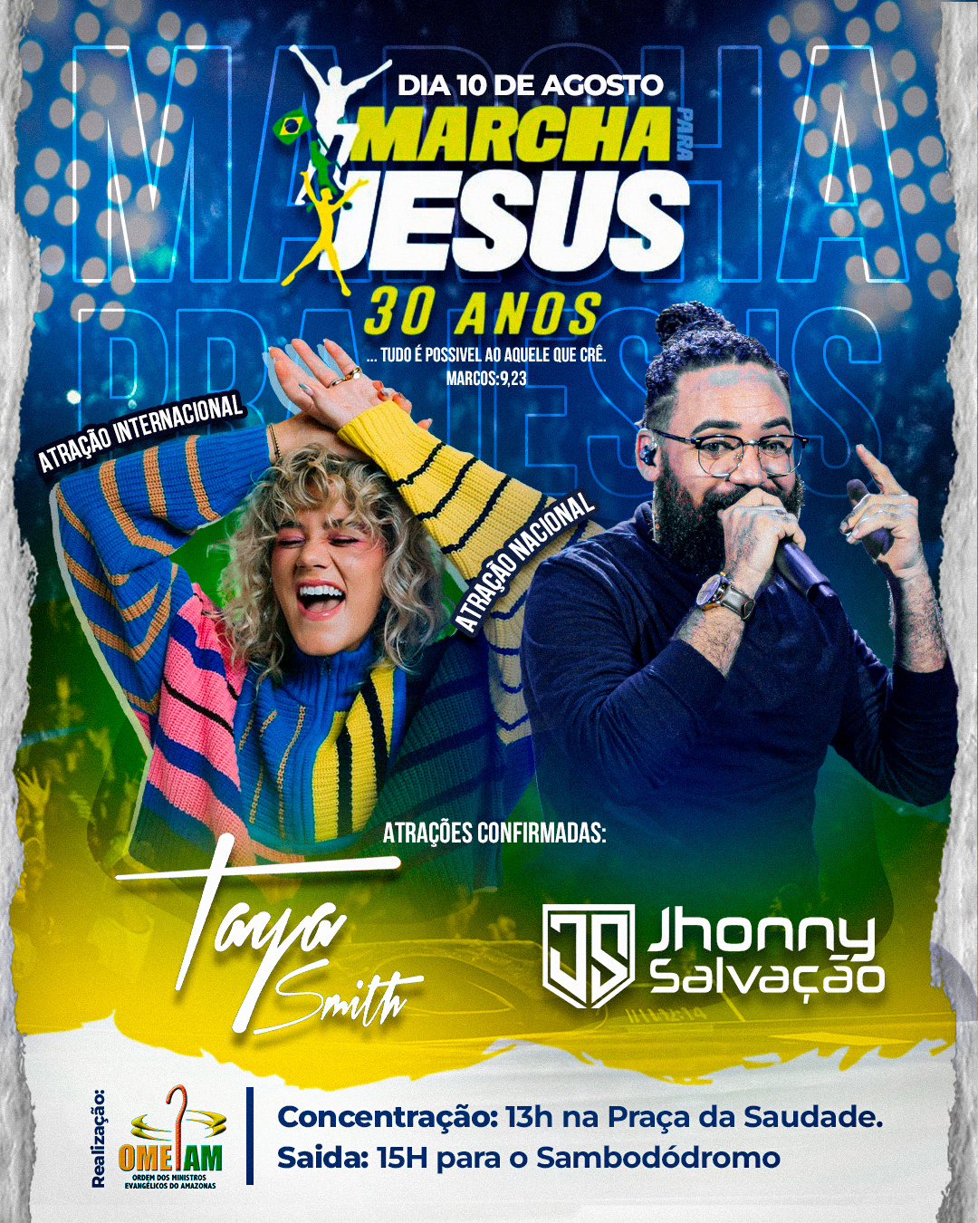 A Ordem dos Ministros Evangélicos do Amazonas, confirma para o próximo sábado dia 10 de agosto, a presença da cantora Taya Smith, pela primeira vez em Manaus, que estará celebrando ao Rei Jesus na 30ª edição da Marcha Para Jesus “Tudo é possível ao que crê”. Marcos 9:23.