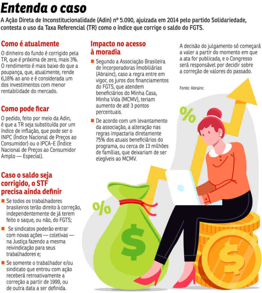 Barroso, além de presidente do Supremo, é relator da ação. Atualmente, o FGTS é corrigido pela Taxa Referencial (TR) acrescida de 3%. O partido Solidariedade, autor do processo, argumenta que, desde 1999, esse índice não é suficiente para repor o poder aquisitivo dos trabalhadores. Por isso, a legenda pede que a TR seja substituída por um indicador ligado à inflação, como o Índice Nacional de Preços ao Consumidor (INPC).