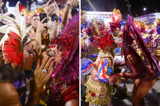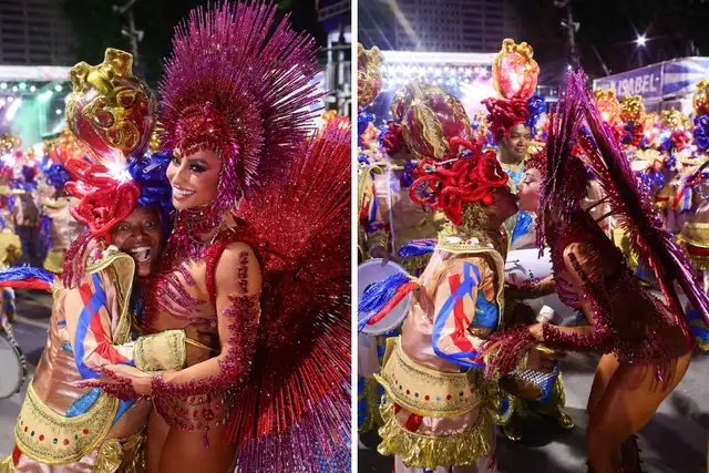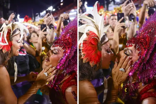 Em sua fantasia alegórica, afinal ela foi toda cristalizada e deixou o glamour vermelho bem aparente, durante o desfile ela beijou Viviane, que já desfilou pela agremiação de Sabrina.