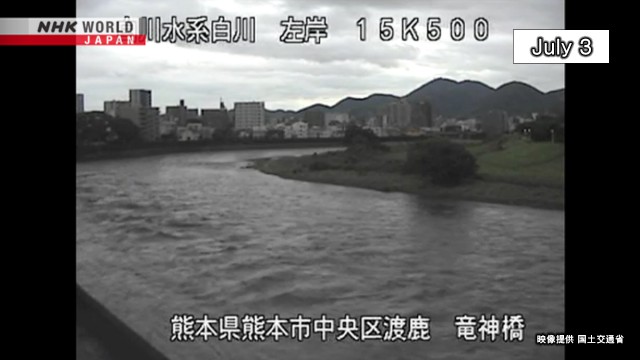 Autoridades da província de Kumamoto dizem que os rios Shirakawa e Mifune excederam os níveis de risco de inundação às 10h da manhã desta segunda-feira.
