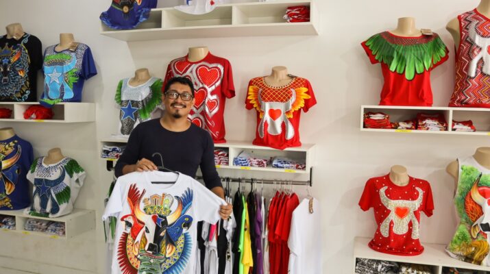 “Esse ano começou atípico com a evidência nacional do festival, os primeiros pedidos chegaram ainda no Carnaval, incluindo de grandes marcas. Firmei parceria e estou focado na produção em grande escala sem perder a exclusividade”, disse o artista visual Irlan Carvalho, que atua desde 2015 com a pintura de camisas em Parintins, onde cria verdadeiras obras multicoloridas.