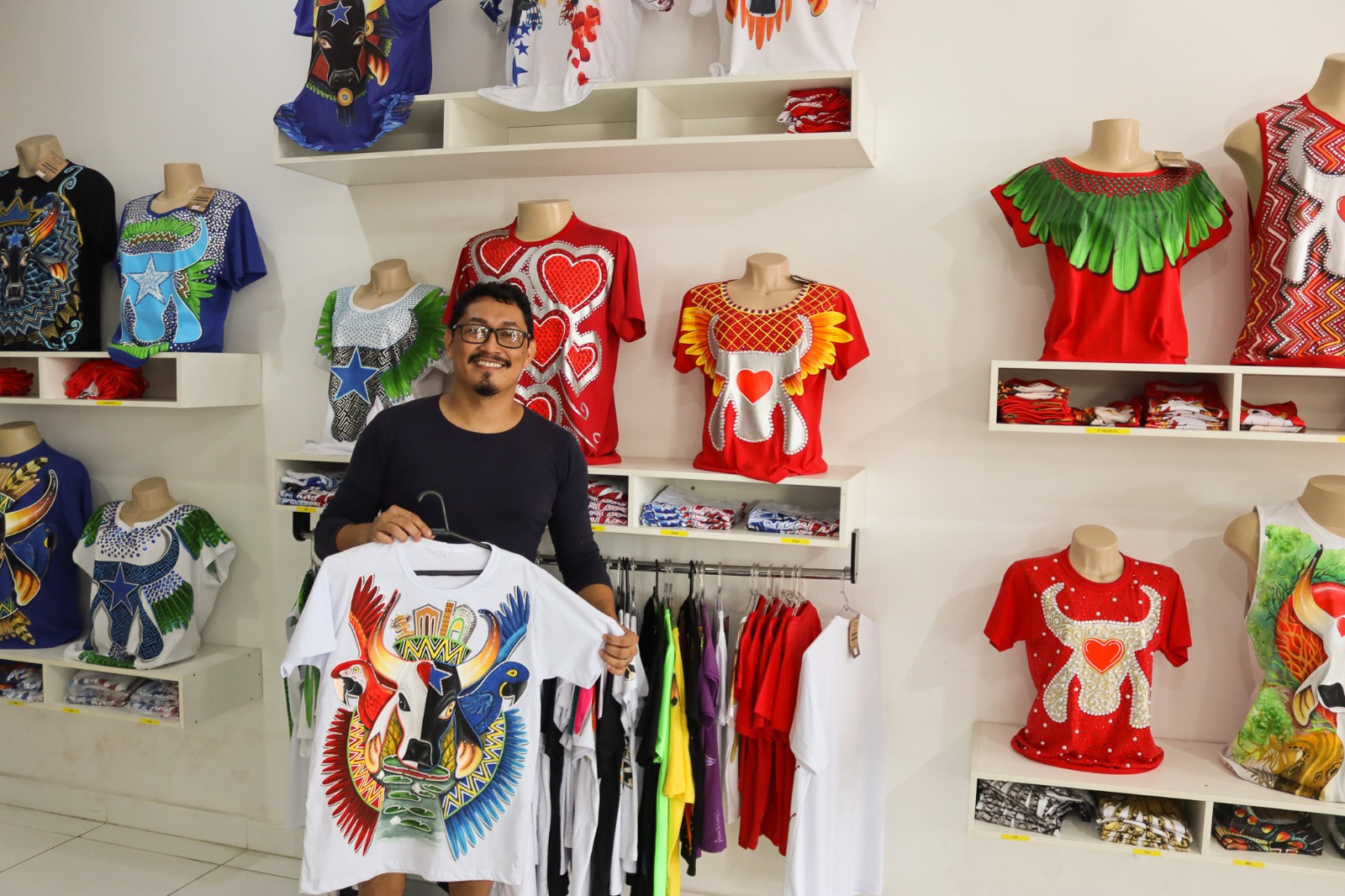 Referência pelo trabalho personalizado com produção de blusas imersas de temática amazônica e pinturas envolvendo os bois, o artista reforçou que seu diferencial é criar peças únicas.