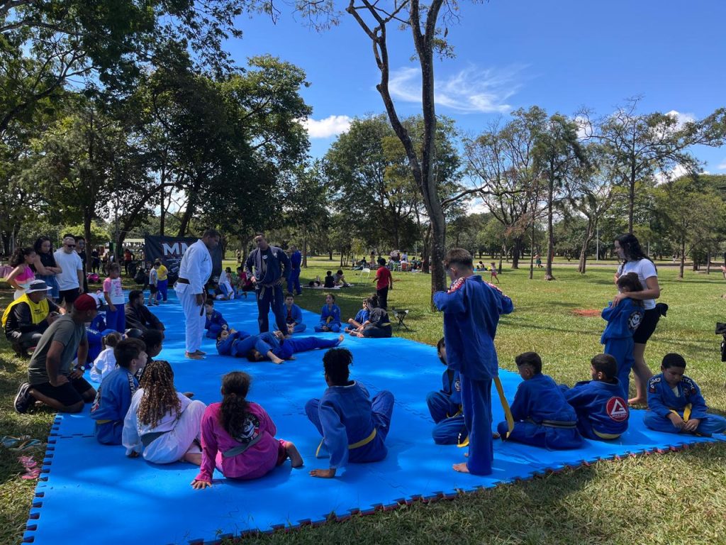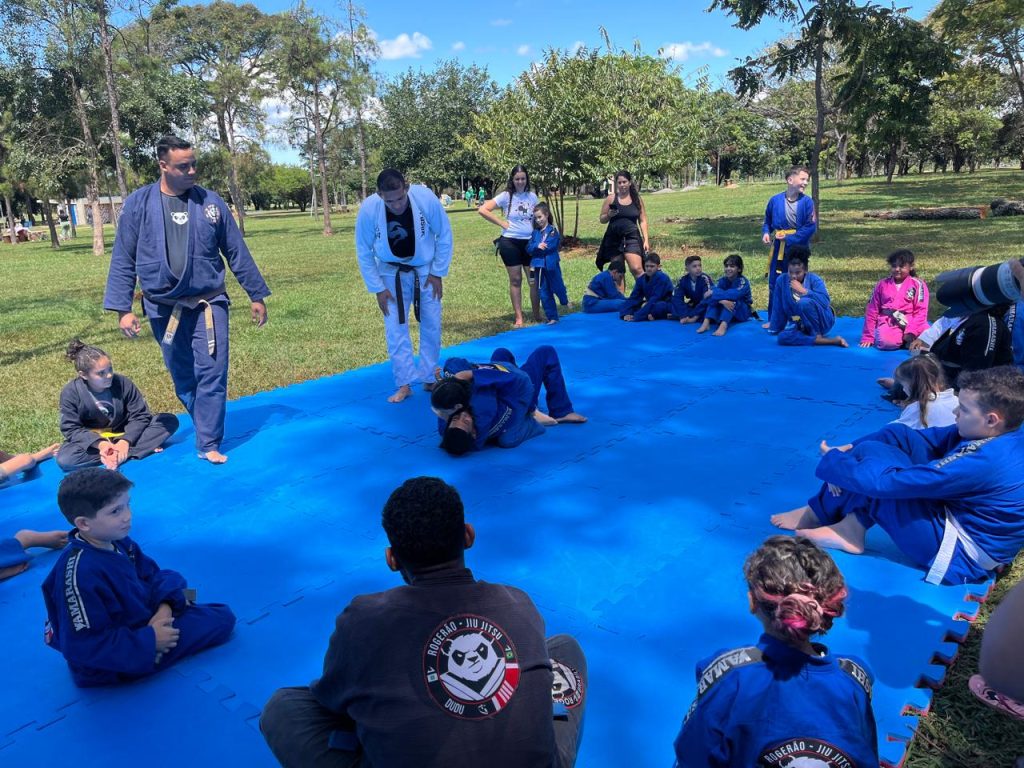 Além de projetos de voluntariado, que existem no próprio Parque da Cidade, como o Correndo com você, que já retratei aqui, um trabalho de corredores guias de pessoas com deficiência visual, o local se transforma também em palco para outros projetos sociais que se apresentam para chamar atenção dos visitantes, mostrar o trabalho realizado, além de aproveitarem o dia com os participantes. Já presenciei várias apresentações de diferentes projetos, iniciativas e grupos de pessoas com alguma finalidade social e educativa por lá. Outro dia me chamou atenção uma grande quantidade de crianças lutando Jiu Jitsu. Achei que se trava de algum campeonato e me aproximei para assistir um pouco. Foi quando conheci um dos responsáveis pelo evento, Eduardo Santos, que, com muita gentiliza, conversou comigo.