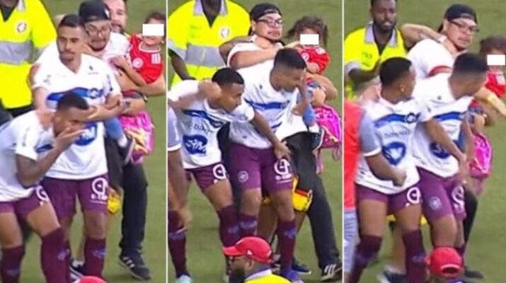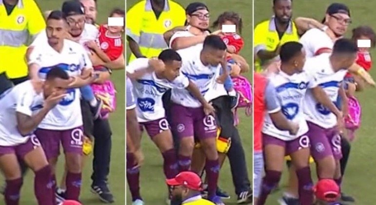 Na sequência, um torcedor que estava com uma garotinha no colo também invadiu o gramado e deu um chute por trás em um dos atletas do Caxias. Os seguranças tentaram contê-lo.