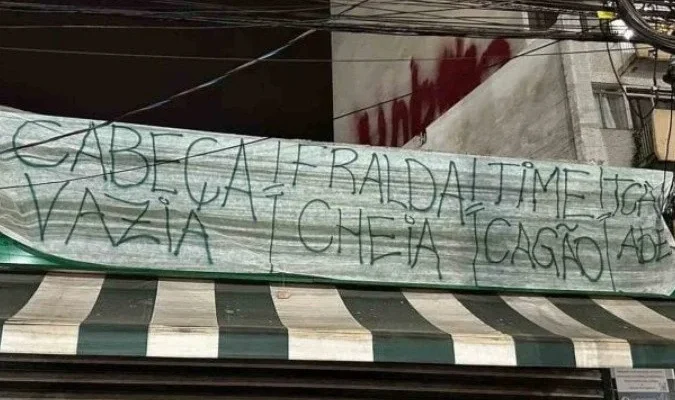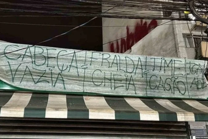 Uma das mensagens ironizava o lema popularizado por Abel: “Cabeça fria, coração quente” virou “Cabeça vazia, fralda cheia, time cagão”. Outra pedia a saída do treinador, com um direto “Fora, Abel”, enquanto uma terceira apontava críticas à gestão: “Presidente inexistente, diretoria incompetente”.